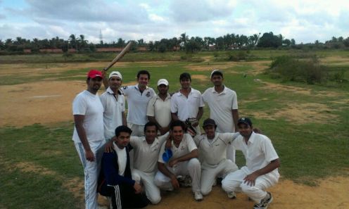 Standing (L to R): Badri, Dinesh P, Goutham Chakravarthi (C), Bhargav, Harsha (WK), Vinay MH