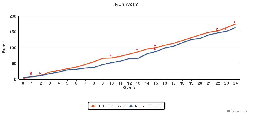 The fall of Deepak in the 15th over brought Padmanabhan to the wicket. With close to 9 runs  needed every over in the last 10 overs of the game, a mixture of lusty hitting and swift running across the next 6 overs substantially swung the moment of the game to ACT before Rohit attempted a poor single to the wicket-keeper Yugank cost him his wicket. The pair had put on 56 runs in 40 balls and with 35 needed in the last 4 overs the game seemed theirs to lose.Run Worm_cecc_act_30_mar_2013