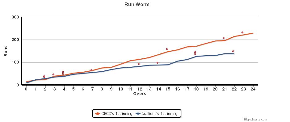 Goutham disappointed CECC by failing to register the first century for the club when he fell 21 runs short trying to clear the legside boundary only to find the fielder at deep square leg. But quick runs from Kaustubh ensured CECC had set a whopping target of 230 for Stallions.