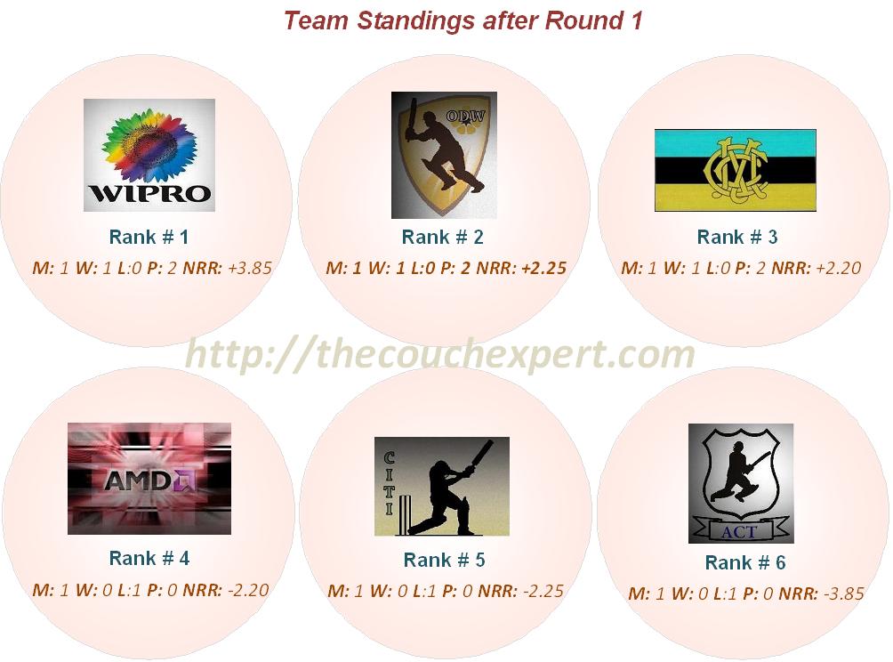 WIPRO, Mavericks Cricket Club (MCC) and One Day Wonders (ODW) all registered wins last Sunday, but WIPRO head the league standings with a superior net runrate of +3.85 followed by ODW (+2.25) closely followed by MCC (+2.20).