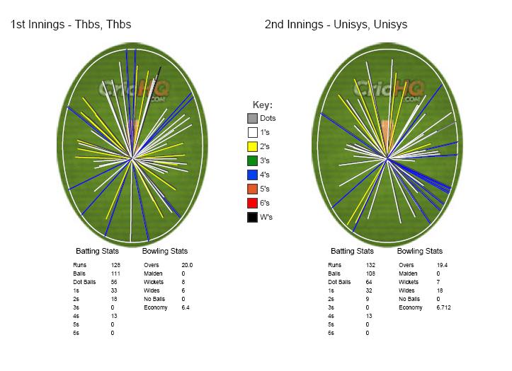 Harish and Vikram mended the innings with a little partnership that put the innings back on track and with Harish looking good to anchor the chase to a win but fell in the 10th over as THBS kept Unisys under 6 an over. Abid joined Vikram and the pair put on another crucial partnership over the next 5 overs to set up the chase beautifully.