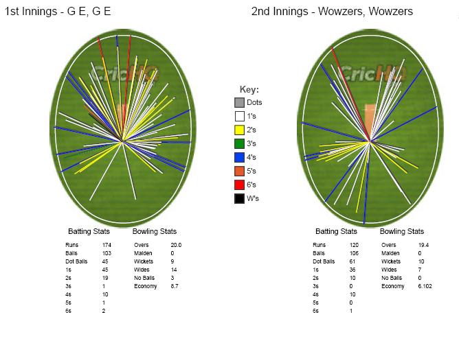 Chasing a steep target, Muzaffer slammed the first ball he faced from Dheeraj over mid on for a massive six. Dheeraj struck immediately trapping Muzaffer in front the next ball. Suresh and Ravi looked good and as has been their bane through the tournament, converting starts to meaningful scores let Wowzers down again.