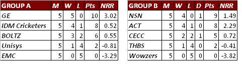 Rakesh though broke through with tremendous big hitting to keep Unisys in the hunt. His entertaining and enterprising 30 thought still was not enough as ACT held their nerve as Bavesh produced an outstanding last over to land his team a close but satisfying 6 run win that provisionally put ACT on top of Group B.